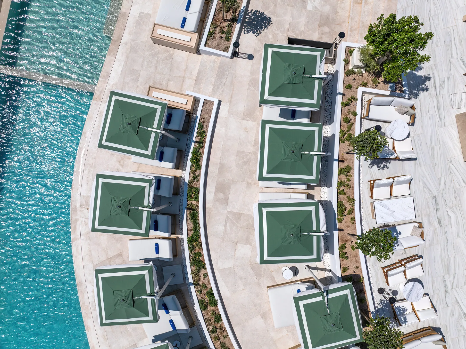 The resort’s palette takes its cues from Santorini’s natural beauty, with whitewashed woods, local stone, marble, and vibrant accents of blue and sage reflecting both the sea and vibrant bougainvillea.